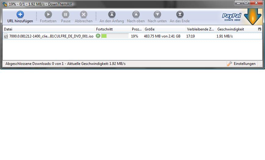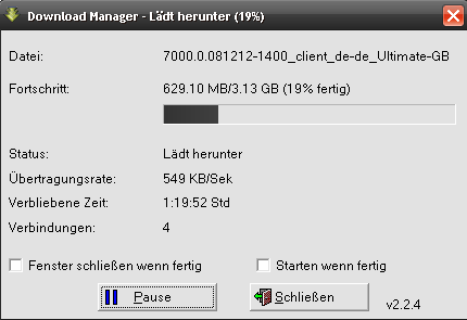 >|Sh4d0w|< schrieb:Hab auch ne Frage. Wenn ich mir Win 7 x64 von CB runterlade, dann werden nur 28,4 MB anstatt denn regulären 3,1 GB runtergeladen (soviel werden auch im FF angezeigt. Die Alternative wären ja hier die Server von MS, aber anscheinend haben die einen riesen Traffic, weil ich nur mit max. 16 kb/s saugen kann (DSL 2000)