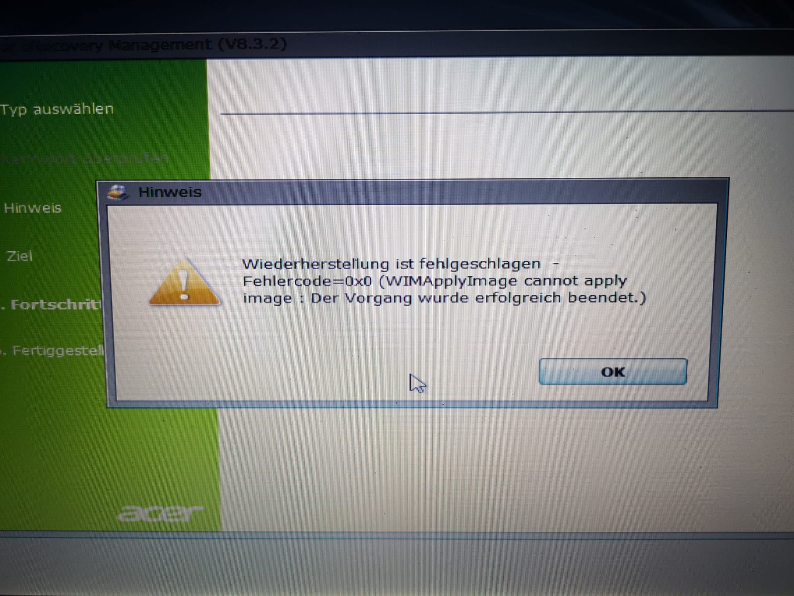 Jedenfalls weiß ich nicht ob das ein Hardware oder Software Problem ist da die wichtigsten Dateien vom Laptop vor paar Jahren eh schon auf meinem PC gelandet sind hatte ich kein Problem damit den PC auf Werkseinstellungen zurückzusetzen das hat jedoch ungewöhnlich lange gedauert und paar Stunden nach dem da stand bite warten sie, kommt eine Fehlermeldung. (im Anhang)