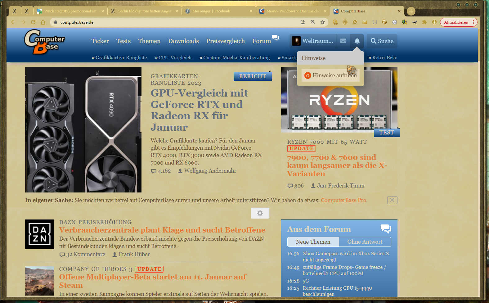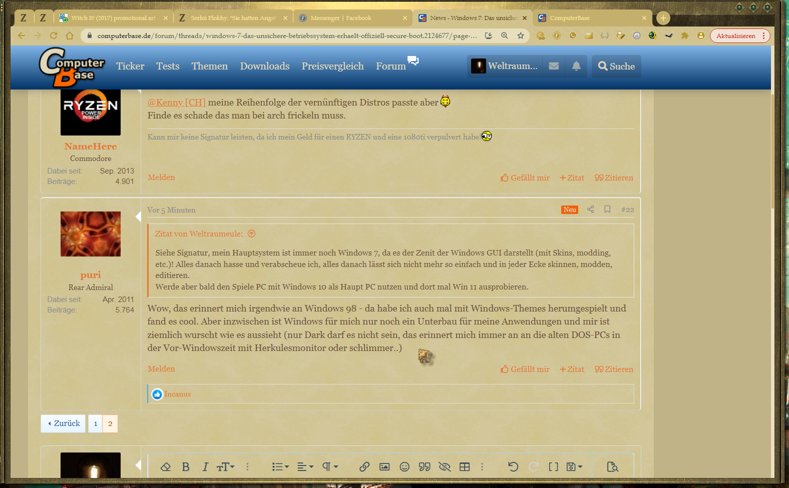 Und für mich ist das ein Hobby, ich habe auch von morgens bis Abends mehrere Wochen lang Programme, z.B. Office 2010 im Hex Editor per Trial und Error eingefärbt um damit diese in das Farbschema des Systems passen. Ich hasse weiße Hintergründe und schwarze Schrift und umgekehrt. Wollte solch ein Vintage System haben. Auch lasse ich per Browser Plugin den lokalen CSS Code von Webseiten ändern, damit eine Schrift mit Serifen habe und die Schriftfarbe geändert wird und jede weiße/helle Oberfläche automatisch per Script geändert wird. So schaut Computerbase bei mir aus und mein Vintage Tisch (passen zum gemoddetem System), die schwarze Plastikmaus habe ich inzwischen durch eine aus Aluminium und Leder ersetzt.