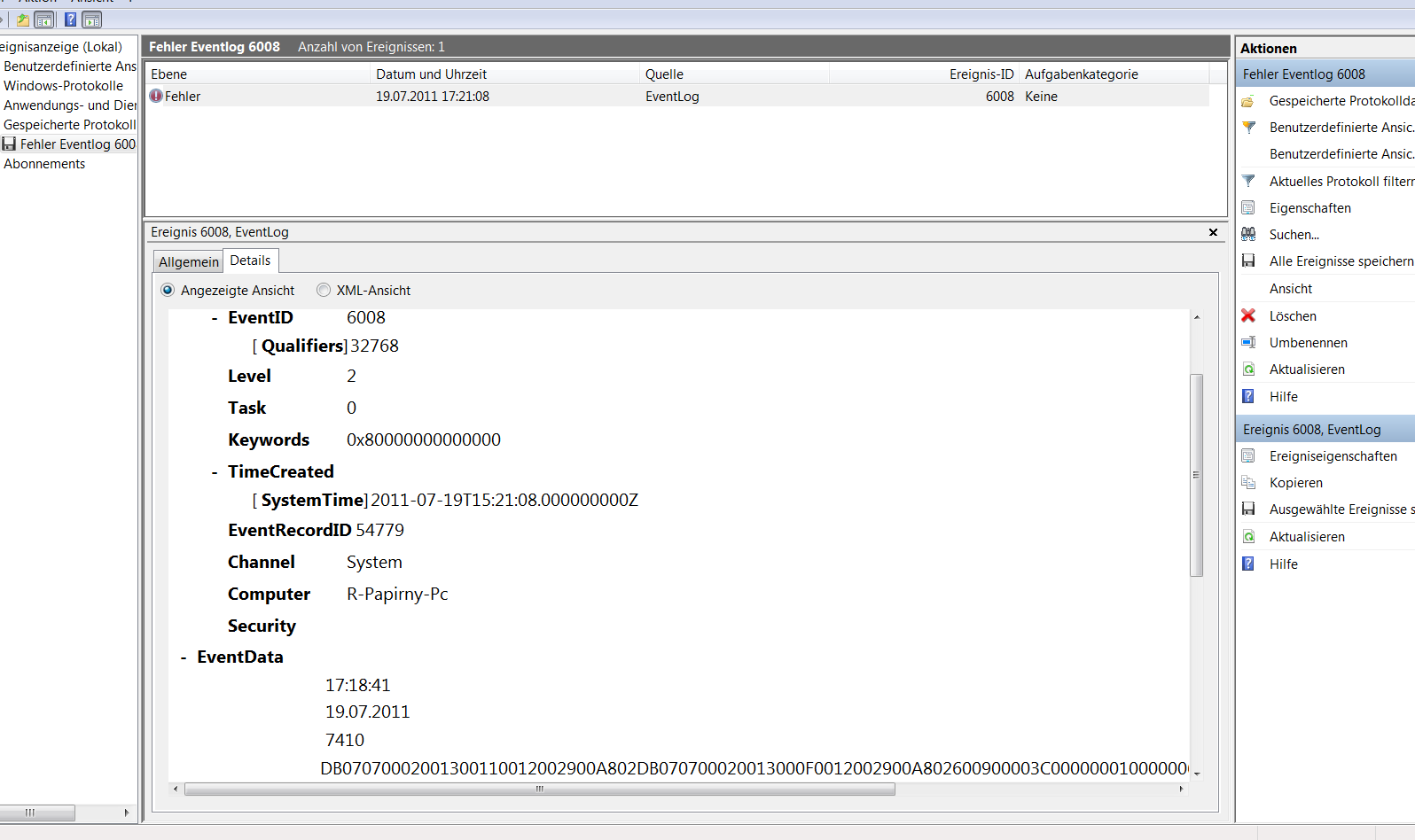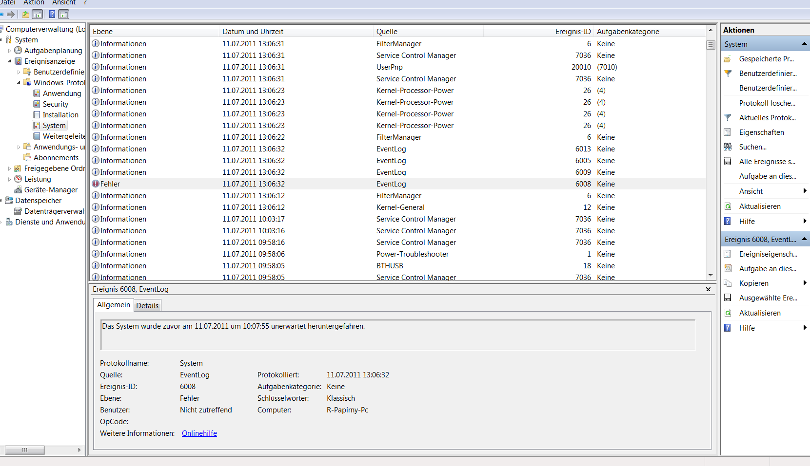 Sonst habe ich damit keine Probleme, er fährt schnell runter und auch wieder hoch, Ruhezustand und Energie sparen funktionieren einwandfrei. In der Ereignisanzeige steht Fehler „Eventlog 6008“