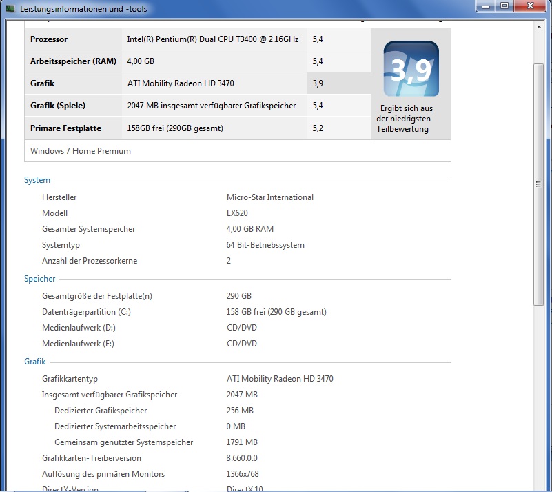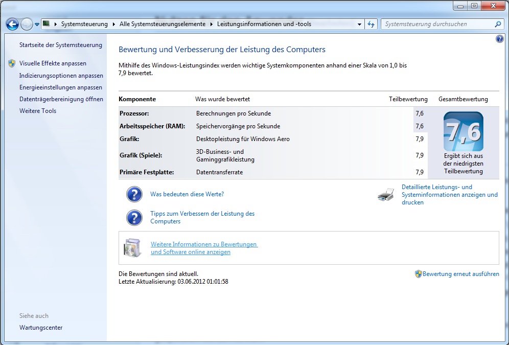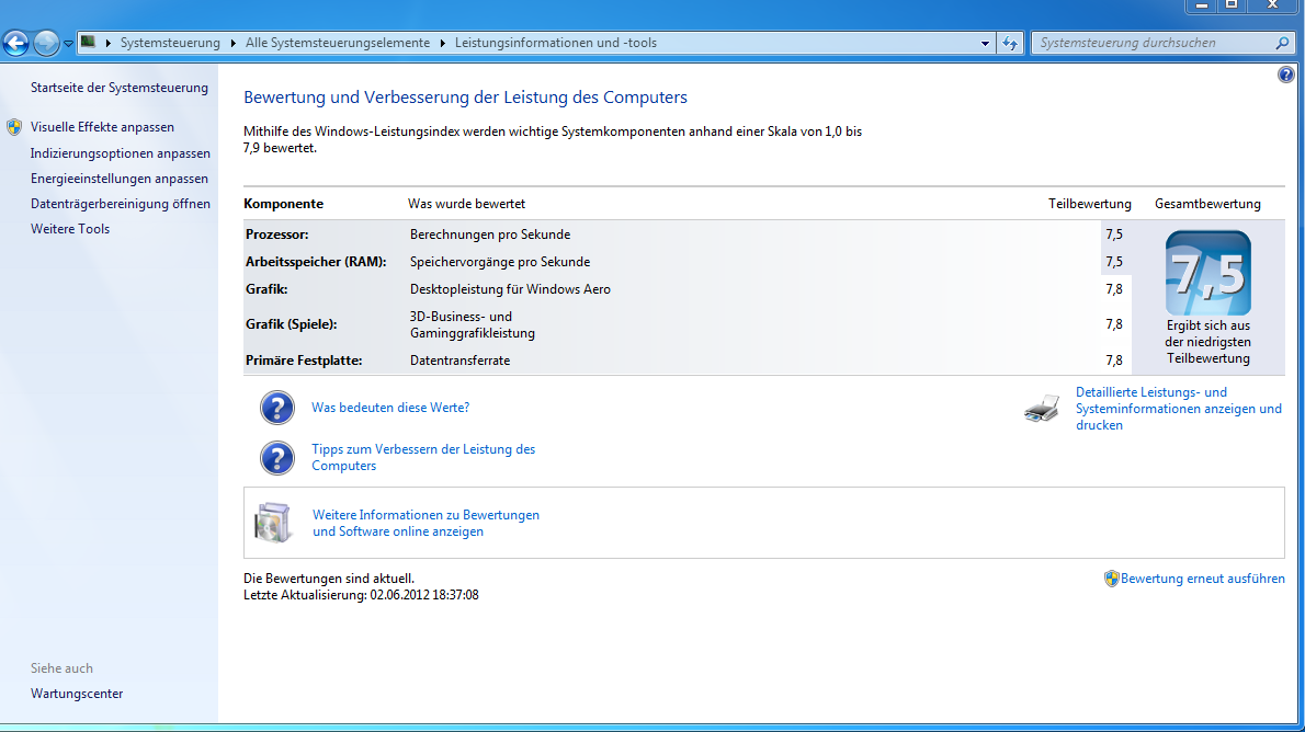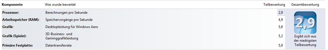 Nun möchte ich nicht auf dem Leistungsindex von Windows 7 herum reiten, habe aber nach dem Neuaufsetzen meines Systems eine Systembewertung unter Windows /-32 Bit durchgeführt. Da kam der Prozessor anscheinend nicht so gut weg. Die Bewertung war eine 2,9. Der Rest des Systems war soweit zufriedenstellend. Ist der AMD X2 wirklich so "schwach", oder warum ist der Wert für den Prozessor so gering? Ich weiss, dass ich keine Rakete habe, aber ich hatte vor dem AMD einen Intel E6300, und hatte den Eindruck, das der E6300 etwas permormer war, und der ausgegebene Wert auch höher war. Ich ging eigentlich davon aus, das ich einen Schritt nach vorne machen würde. Scheint mir aber auch beim arbeiten unter Windows 7 nicht so zu sein.