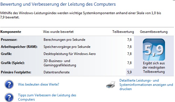 Was mich auch stark interessiert ist, ob jemand mit einer Magnetfestplatte mehr als 5,9 Punkte hat... Vielleicht achtet Windows 7 ja nicht nur auf die sequenzielle Performance, sondern auch auf die Reaktionszeiten