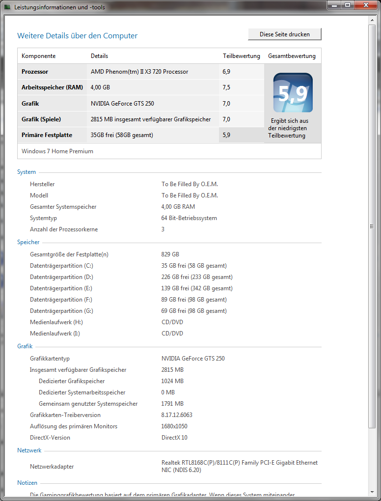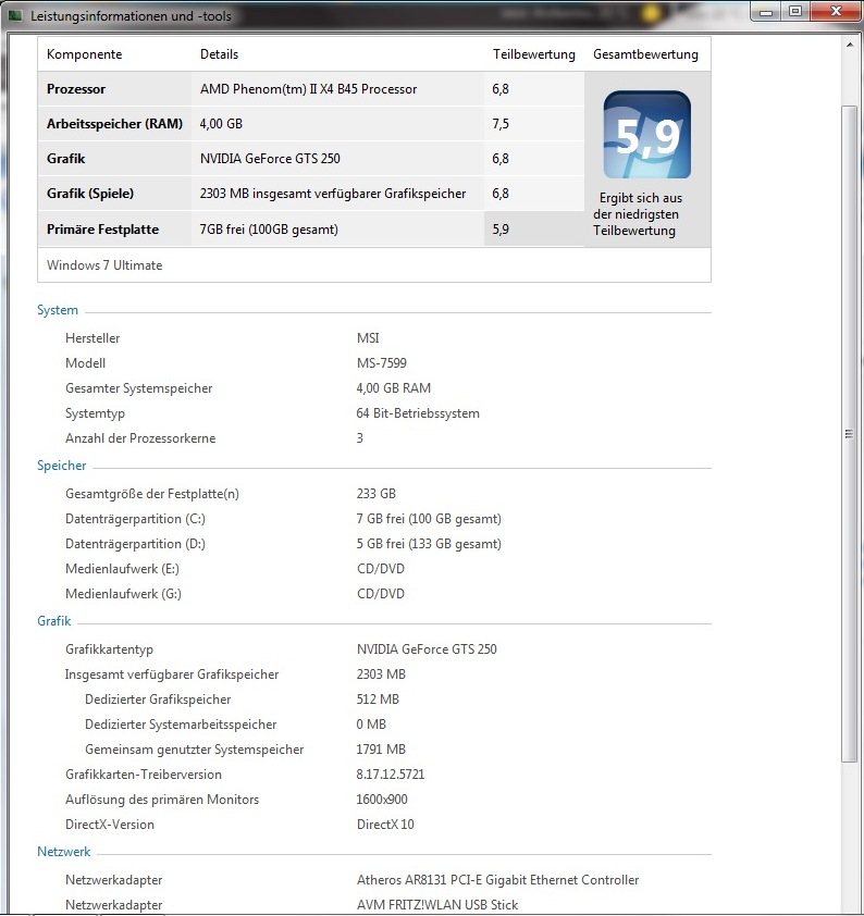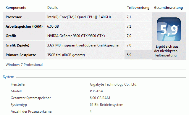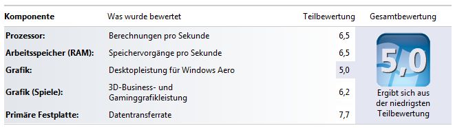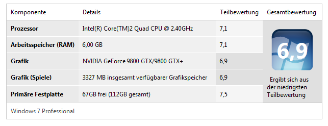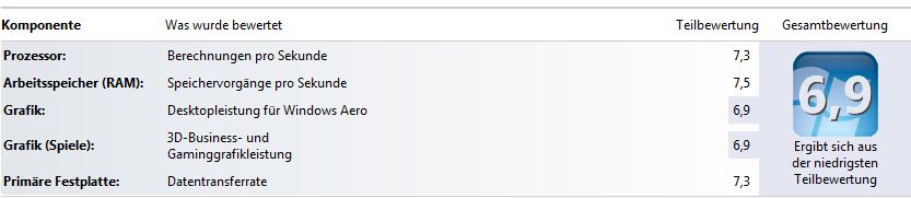 ...ich hab mal meine Systemplatte gegen eine Corsair Force SSD mit 120 GB getauscht, und bin damit von gesamt 5.9 auf gesamt 6.9 gerutscht.