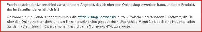 Sie können dieses Sonderangebot nur über die offizielle Angebotswebsite nutzen. Zwischen der Windows 7-Software, die Sie über den Onlineshop erhalten, und der Einzelhandelsversion gibt es keinen Unterschied. Wenn Sie jedoch eine Neuinstallation auf dem PC ausführen müssen, empfiehlt es sich, eine Sicherungs-DVD zu erwerben.