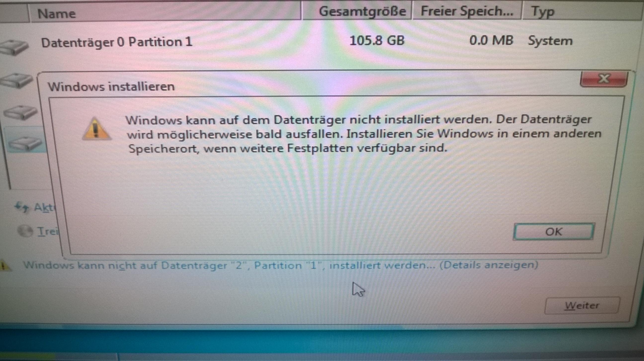 Ich kann Windows 7 nicht installieren, da die HDD anscheinend eine Macke hat (Tools wie CrystalDiskInfo melden dies auch), obwohl diese im normalen Betrieb einwandfrei funktioniert. Weiß einer wie ich diese Meldung umgehen kann und das Setup dazu bringe, Windows zu installieren? Brauche Windows dringend und habe im Moment keinen anderen Datenträger zur Verfügung.