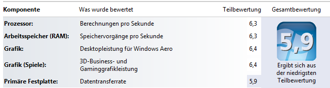 hab heute mal bei Windows 7 den Leistungsindex aktualisiert und komme bei der Festplattenleistung auch nicht über 5.9.