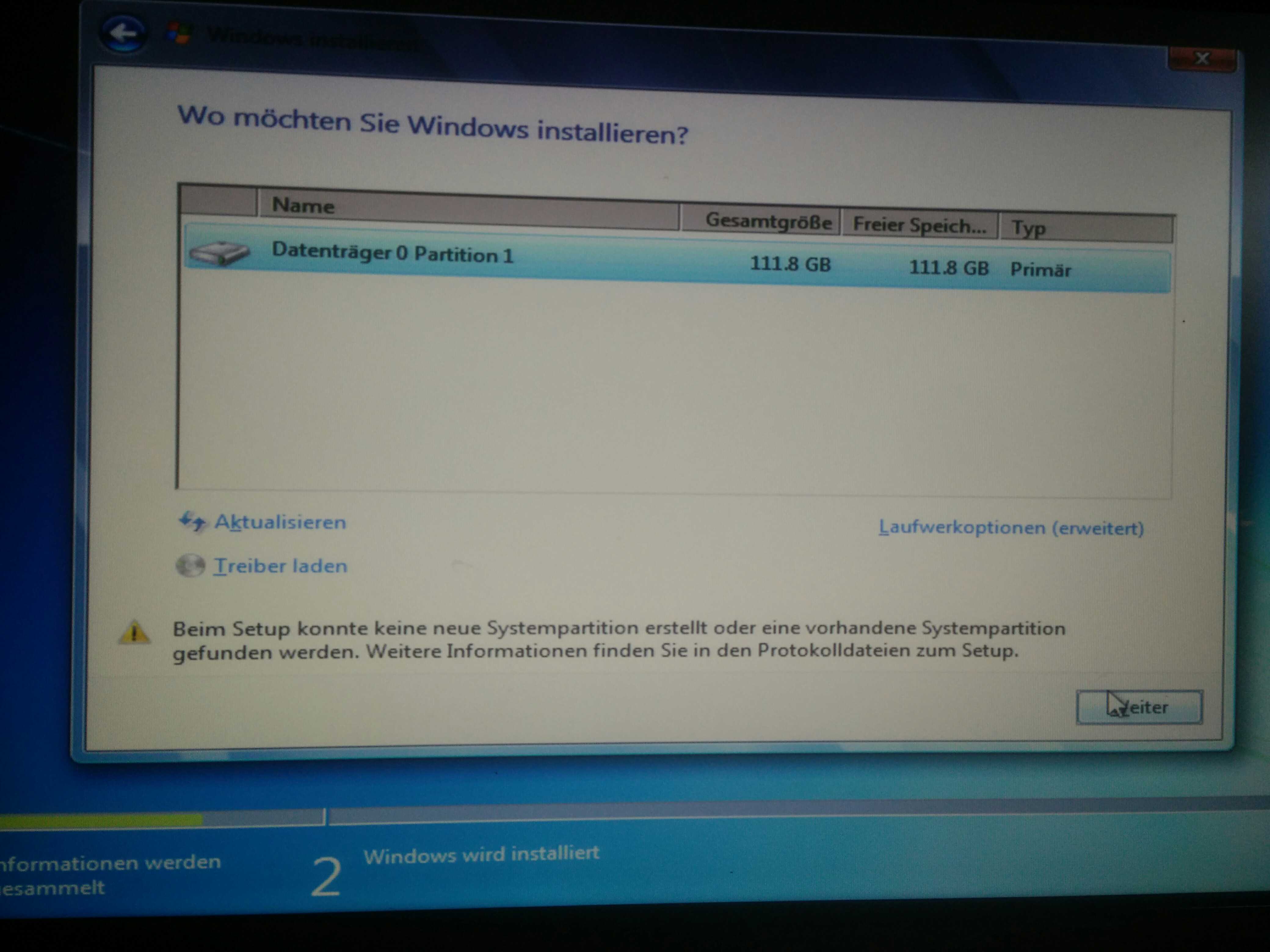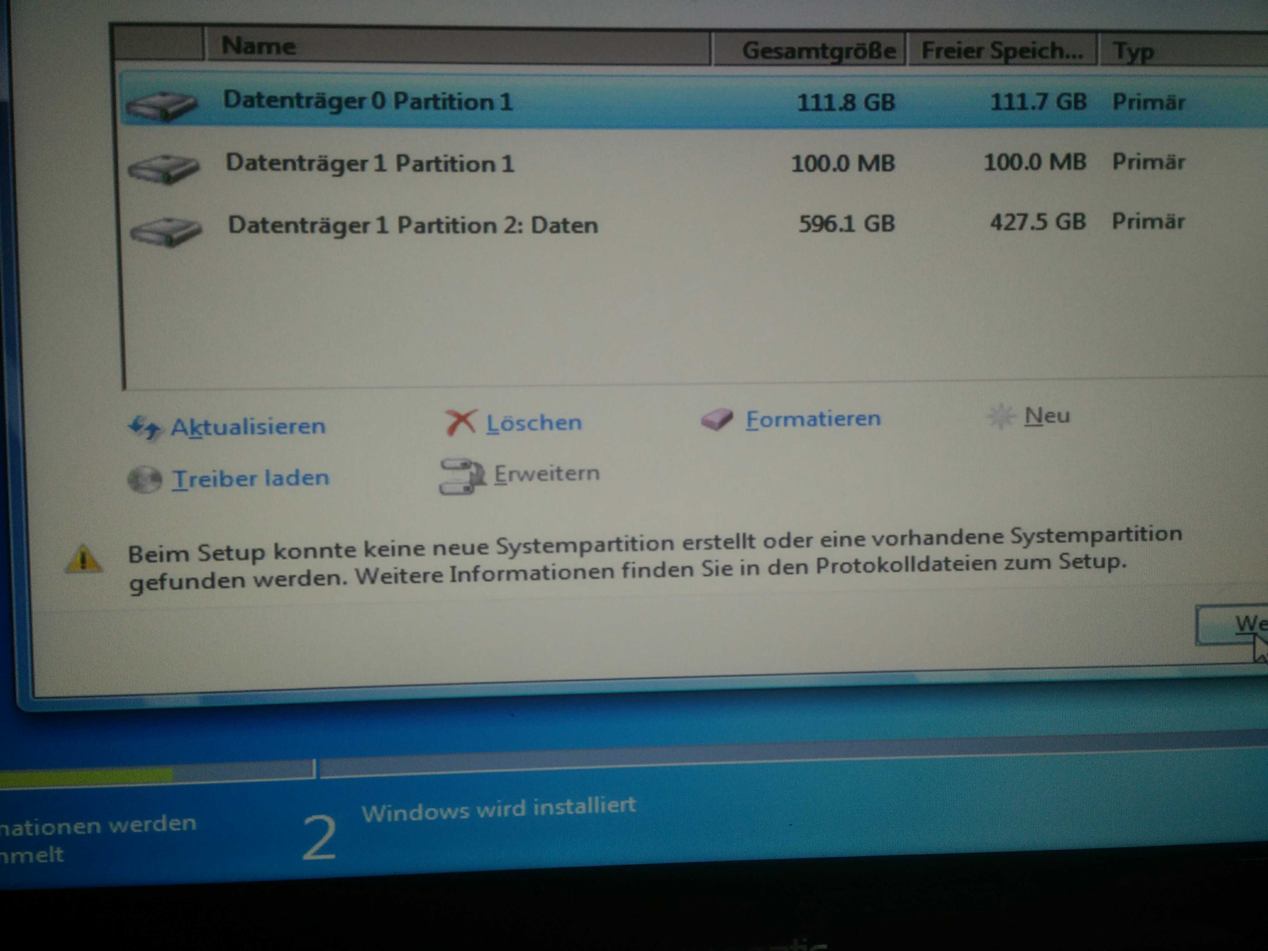 Hab versucht die SSD Partition zu löschen aber wenn ich dann das so lasse und auf weiter Klicke dann kommt das wieder mit der fehlenden Partition