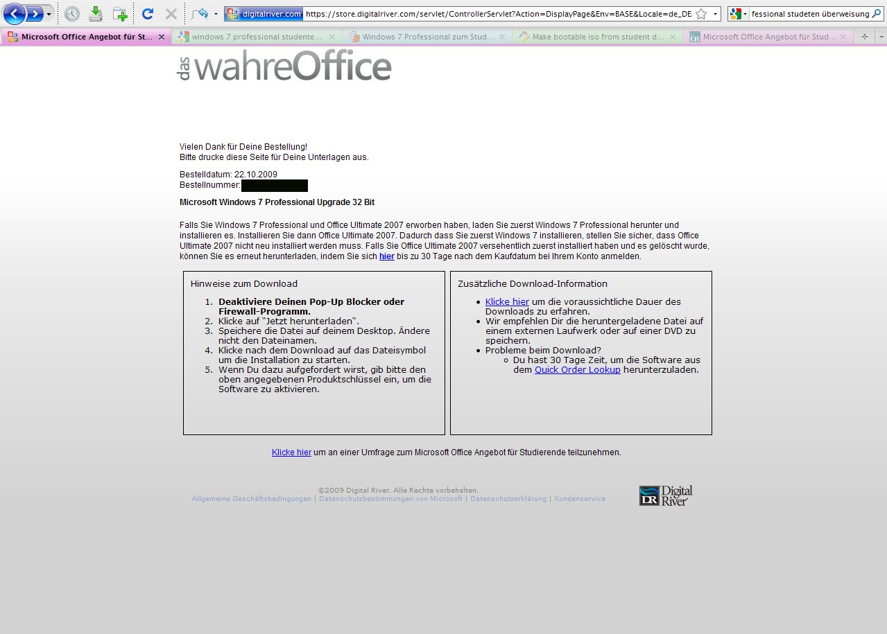 folgendes Problem: Ich habe Win 7 Professional 32 Bit gekauft, meine Daten angegeben und als Zahlart "Überweisung" gewählt. Alles was ich bekam war die angehängte Webseite - keine E-Mail, keinen Key und kein Link "Jetzt downloaden". Was ist denn da jetzt schon wieder schief gelaufen? Oder warten die nur auf meine Überweisung? Und wann bekomme ich die Kontodaten, auf die ich überweisen soll? Und wieso steht da eigentlich "Office" drüber?