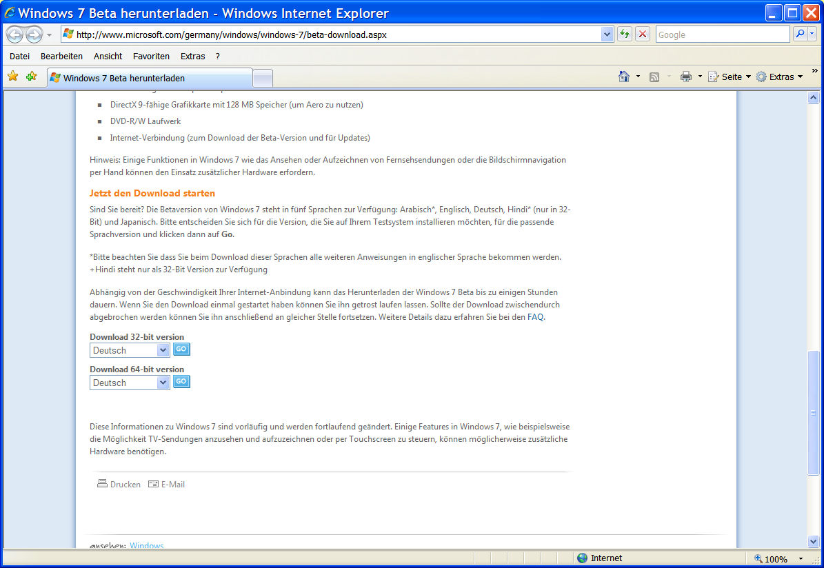 Ich hol mir gerade die 32Bit Version. Leider gurkt der Download-Manager von MS nur mit ~103 kb/sek vor sich hin, trotz 6000er Leitung...Server ist wohl ausgelastet
