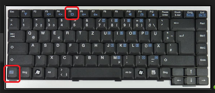 Du hast bestimmt auf deiner Tastatur eine die Blau ist und wo " Fn " drauf steht unten links. Und über der Zahlenreihe eine blaue Taste die wie ein Bildschirm aussieht, hier im Bild die F5 Taste. Drück mal die Fn und dann die F5 / Bildschirmtasten, was passiert dann ? FN anhalten dann F5 drücken. Sorry vergessen