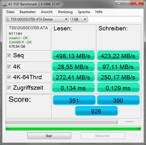 Zum Vergleich meine SSD, Durchschnittswerte für eine 500GB SSD.
