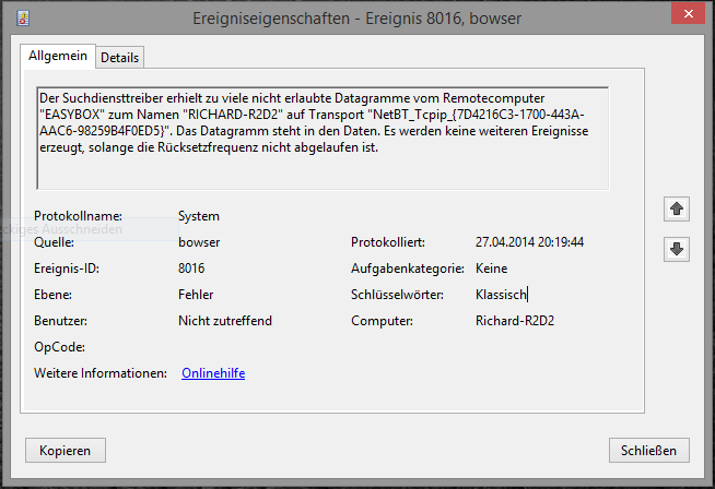 im Moment tritt bei mir der folgende Fehler in der Ereignisanzeige auf. Wie ich herausgefunden habe, gibt es einen Fehler mit der Kommunikation mit der Vodafone EasyBox. Könnt ihr mir helfen?