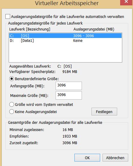 Gesagt getan, 1,5 Fache des Arbeitsspeicher als Auslagerungsdatei festgelegt. Das T100a hat 2 Gb Ram.