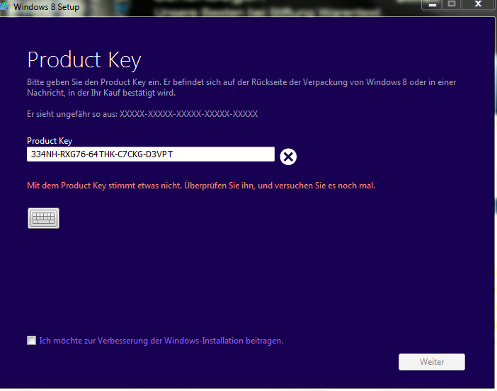 Aber ich kann es ja nicht installieren egal welchen Key ich verwende es kommt immer "Der Produkt Key konnte nicht überprüft werden. Überprüfen Sie bitte das Installationsmedium.