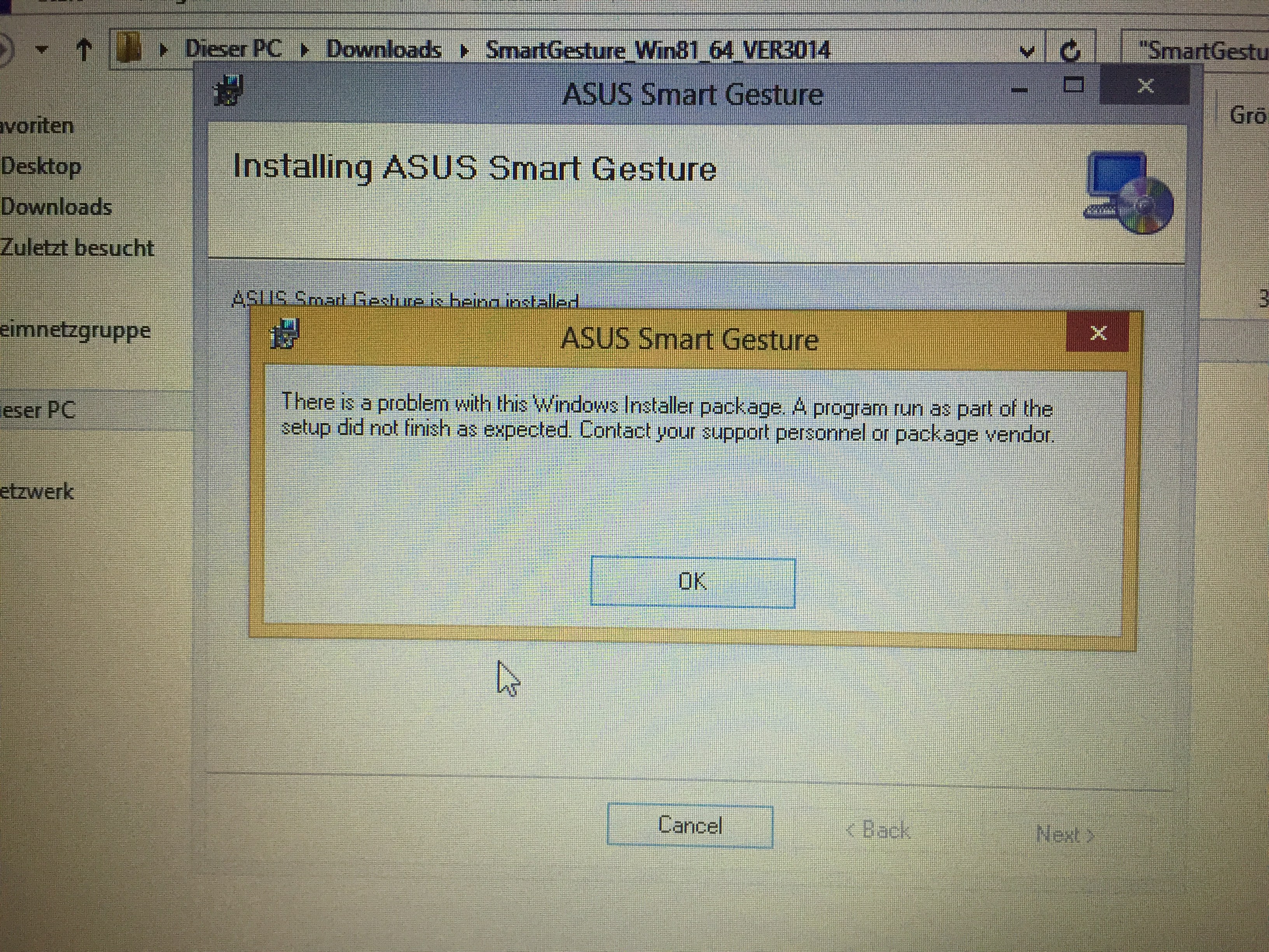 Ich richte gerade ein Notebook neu ein (ASUS X543MA) ein was von Werk aus mit Win 10 Home ausgeliefert wird . Bloß das Problem ist das er in der Firma eingebunden werden soll (Windows Server) und da ein Windows 10 aus vielen gründen nicht reinpasst. Also Windows 8.1 drauf gemacht Funktioniert wunderbar bis auf das Touchpad was noch nicht so will. Treiber kann ich auch nicht installieren da immer eine Fehlermeldung kommt Anbei das bild.