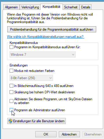 Bei einem Freund geht auf seinem Windows 8.1 nur noch die Kompatibilität Einstellung von (Programm als Administrator ausführen) wie (Kompatibilitätsmodus) nur einstellen wen er mit der Einstellungen für alle Benutzer ändern den hacken bei Programm als Administrator ausführen setzt und Übernehmen bestätigt. Wenn er es ohne Einstellungen für alle Benutzer ändern einstellen möchte sind die hacken nach dem Bestätigen von Übernehmen zwar da aber nach erneuten öffnen der Eigenschaften vom Startenden Programms sind die hacken in der Kompatibilität wieder weg nur über Einstellungen für alle Benutzer ändern geht es Programme als Administrator ausführen einzustellen