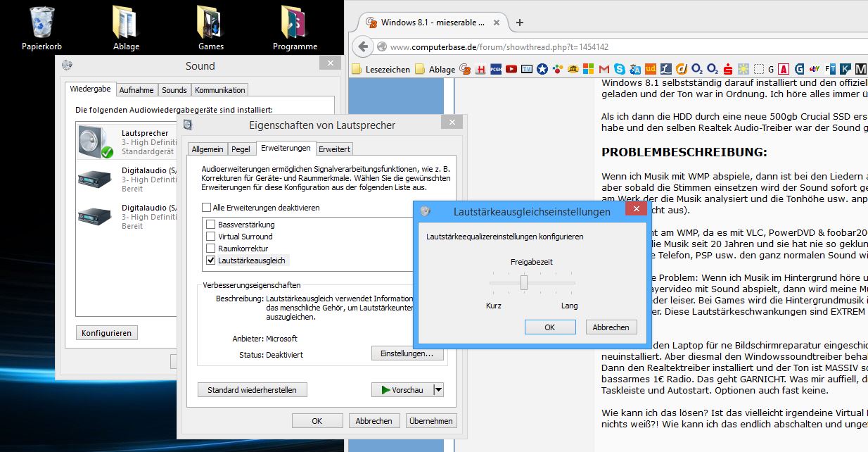 Das nächste Problem: Wenn ich Musik im Hintergrund höre und dann im Browser (egal ob Firefox, IE oder Chrome) ein Flashplayervideo mit Sound abspielt, dann wird meine Musik SPÜRBAR lauter, sobald ich das Video stoppe wird der Ton wieder leiser. Bei Games wird die Hintergrundmusik im WMP schlagartig leiser. Wenn ich das Game beende wieder lauter. Diese Lautstärkeschwankungen sind EXTREM nervig. War bei meinem alten Windows 7 PC niemals so.
