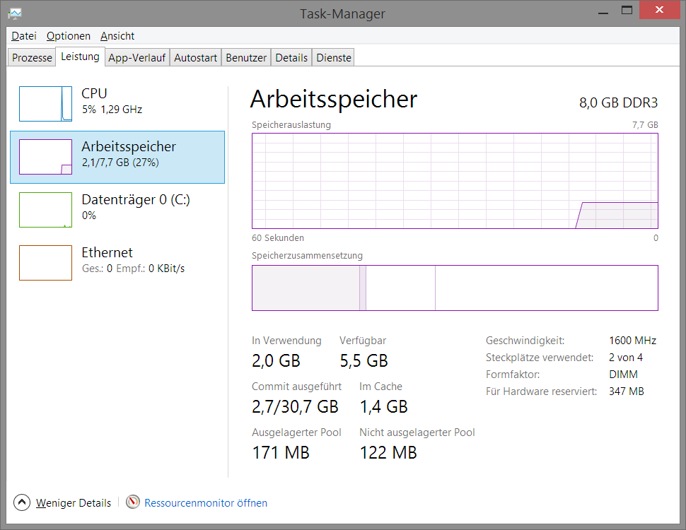 Im Task-Manager habe ich habe ich 22% an Speicherauslastung.