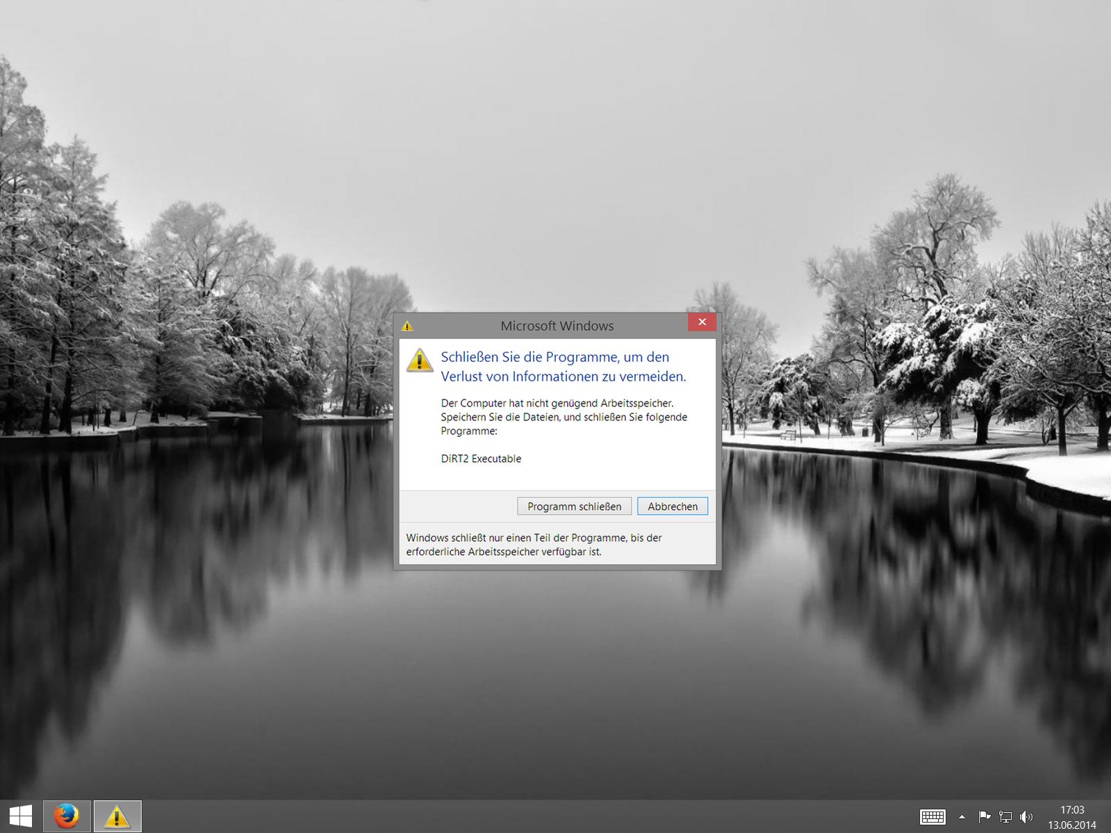 Ich bekomme bei Spielen wie DiRT 2 oder BF3, manchmal die Meldung das ich nicht genügend Arbeitsspeicher hätte. Bei DiRT 2 bekomme ich das sogar nach jedem Start. Dabei habe ich 8 GB Arbeitsspeicher, DiRT 2 hat somit 22% an Speicherauslastung. Ich habe hier einfach mal Screenshots davon gemacht.