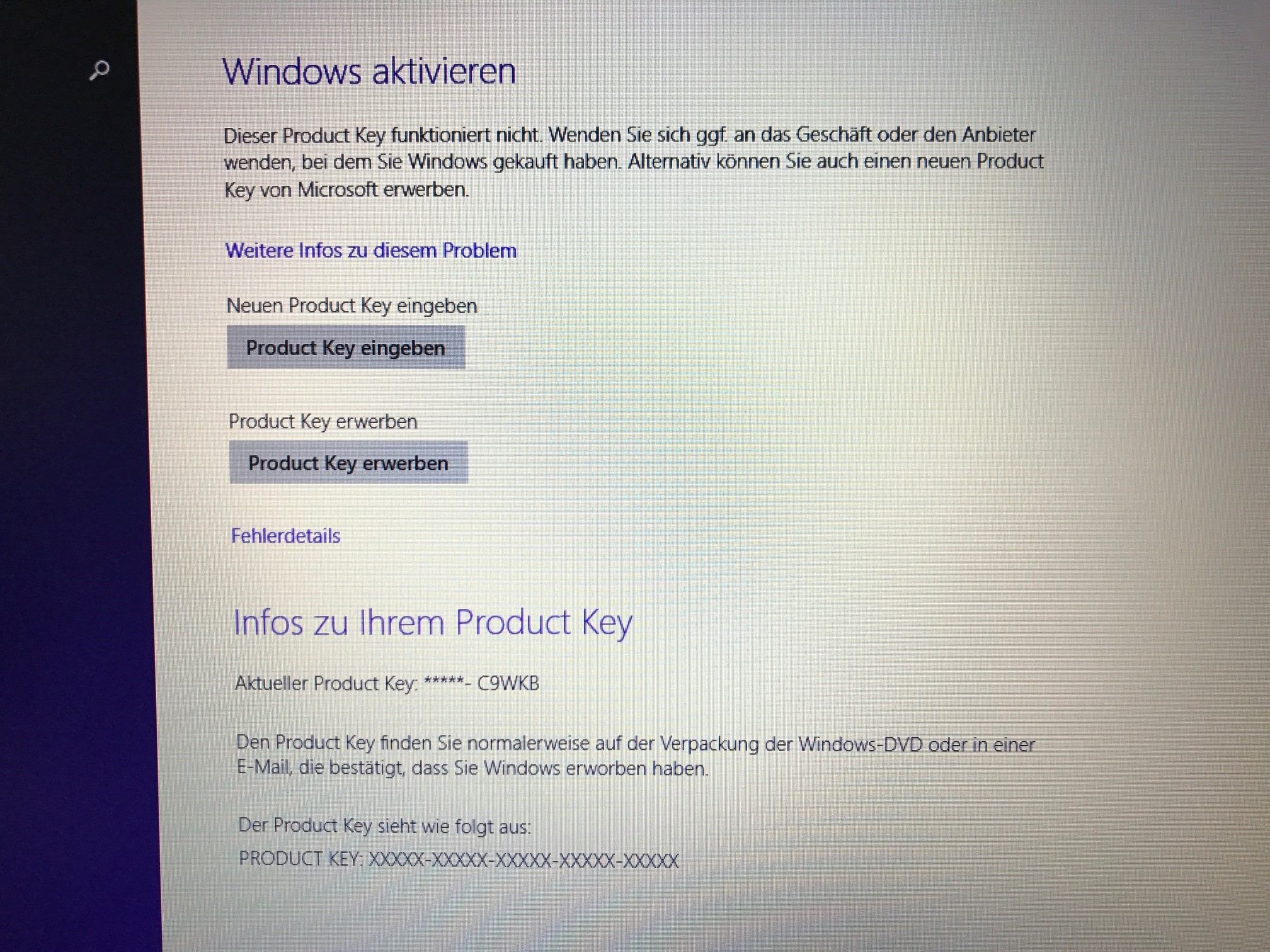 Jetzt weiß ich nicht was ich tun soll. Ein Tool (Windows 9 Product Key Viewer), was den Windows Key ausliest spuckt mir nur den generischen Schlüssel der Installation aus.