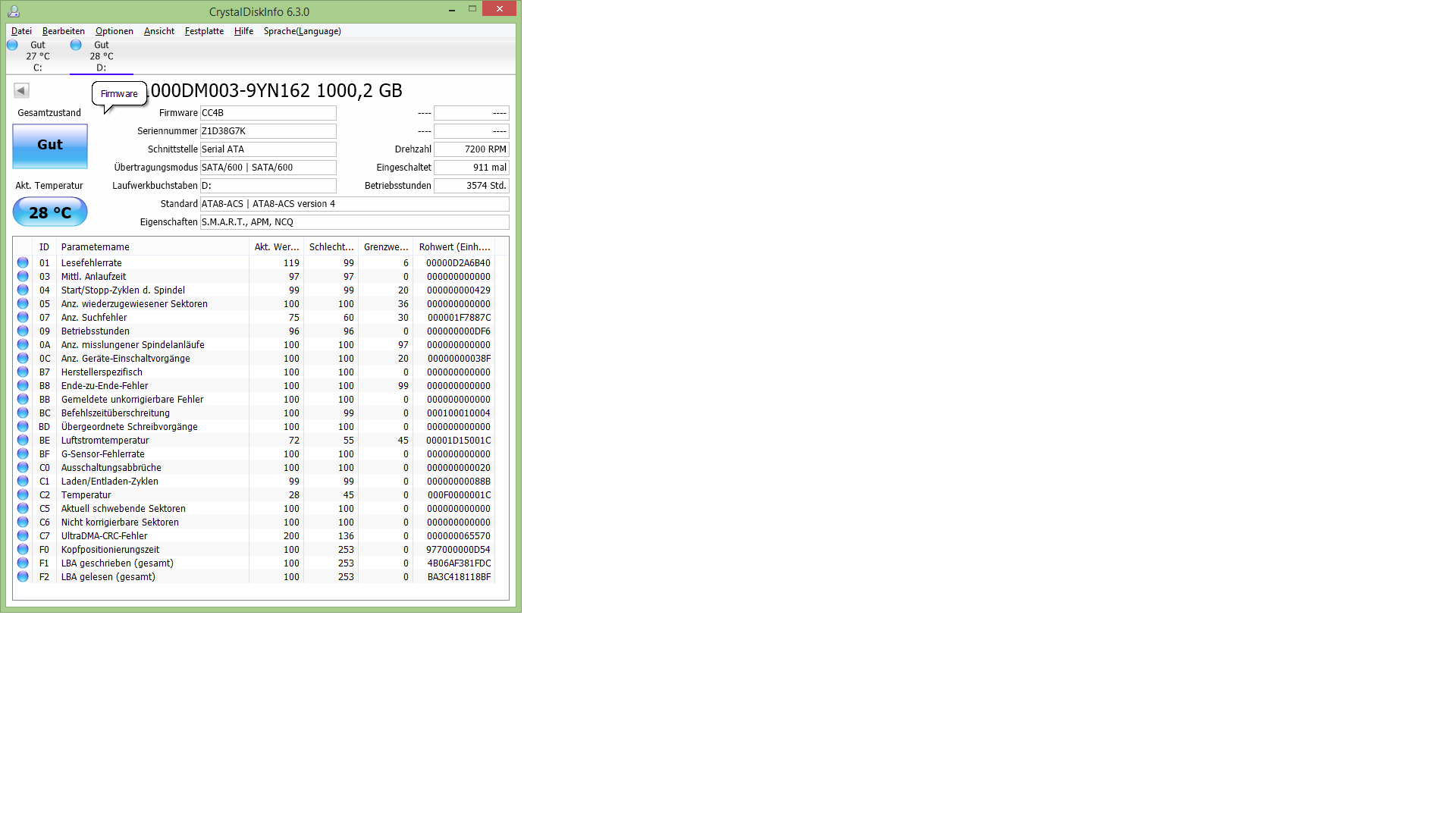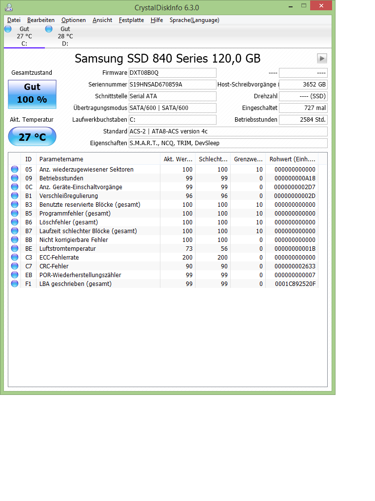 Ah, das hatte ich vergessen zu erwähnen. Hab als das anfing mit der kleinen Einfrierern schon mal mit CrystalDiskInfo rein geschaut. Hier aber dann noch mal 2 Screenshots von den verbliebenen 2 Platten.