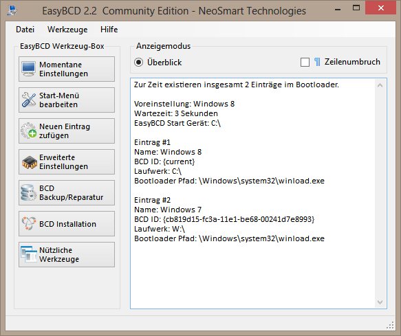 Ist mir persönlich auch zu heikel. EasyBCD ist komisch... Da bleib ich lieber bei der althergebrachten Konsolendarstellung. Siehe auch...