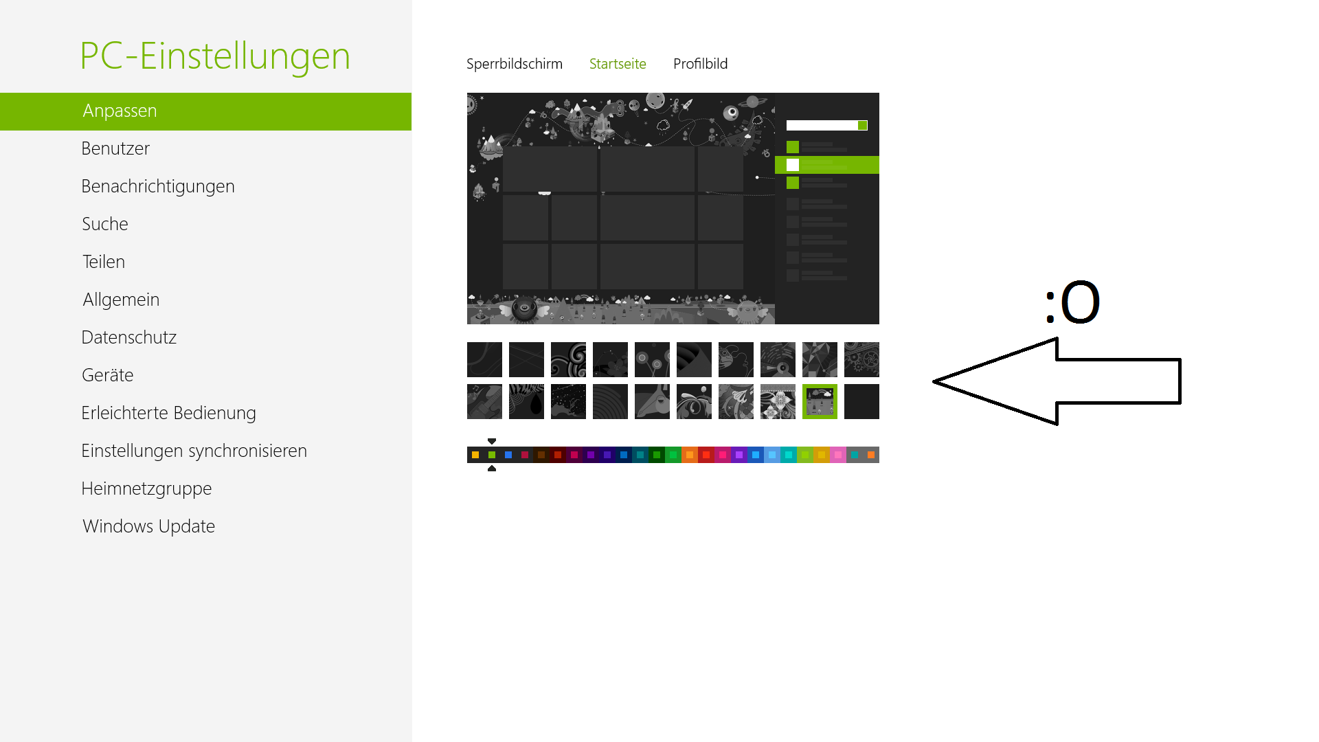 Das ist doch vollkommen logisch: du gehst rechts unten auf die Charmsleiste, gehst auf das Zahnrad, unten auf PC-Einstellungen ändern, "Anpassen", "Startseite" und wählst dann was aus. Dank der Offenheit des Systems darf man auch keine anderen Bilder als die vorgeschlagenen auswählen. Und warum man nicht einfach im Metro-Screen irgendwo rechtsklicken und das auswählen kann? Keine Ahnung, war doch schon immer soimaginez schrieb:Wie hast du eigentlich das Hintergrundbild in den Metroschirm bekommen??