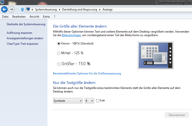 Die Erweiterte Anzeigeneinstellung gibt es wohl nicht mehr. Kannst nur noch die Größe verändern per STRG+Mausrad oder über Anzeige
