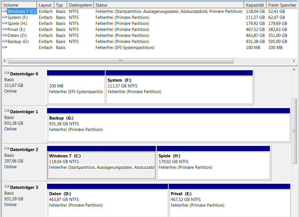 Wie man hier aber schon ersichten kann, ist die ca. 100 MB Startpartition von Windows auf einem MBR System enorm wichtig. Diese gibt es aber auf einem GPT System nicht, dafür eine 100 MB große EFI Systempartition.