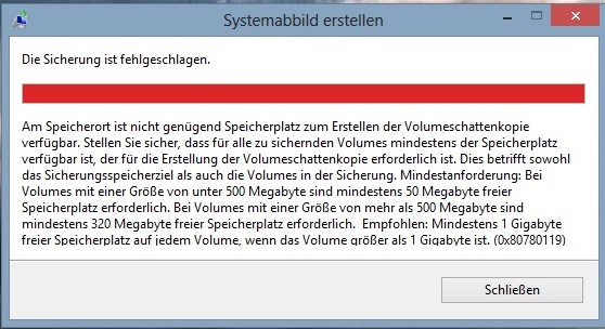 Windows 7/8 legt bei der Installation eine Partition mit 100 MB an, in der die Startdateien abgelegt werden. Wenn diese zu mehr als 50 MB belegt ist, bricht die Sicherung mit dem Fehlercode 0x80780119 ab.