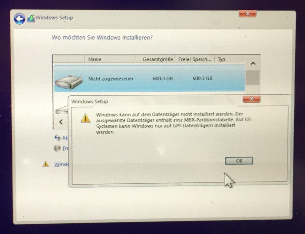 Jetzt verweigern aber die von mir verwendeten Installationsmedien den Dienst, mit der Begründung, dass Windows nur unter GPT installiert werden kann, wenn der EFI-Bootmodus verwendet wird: