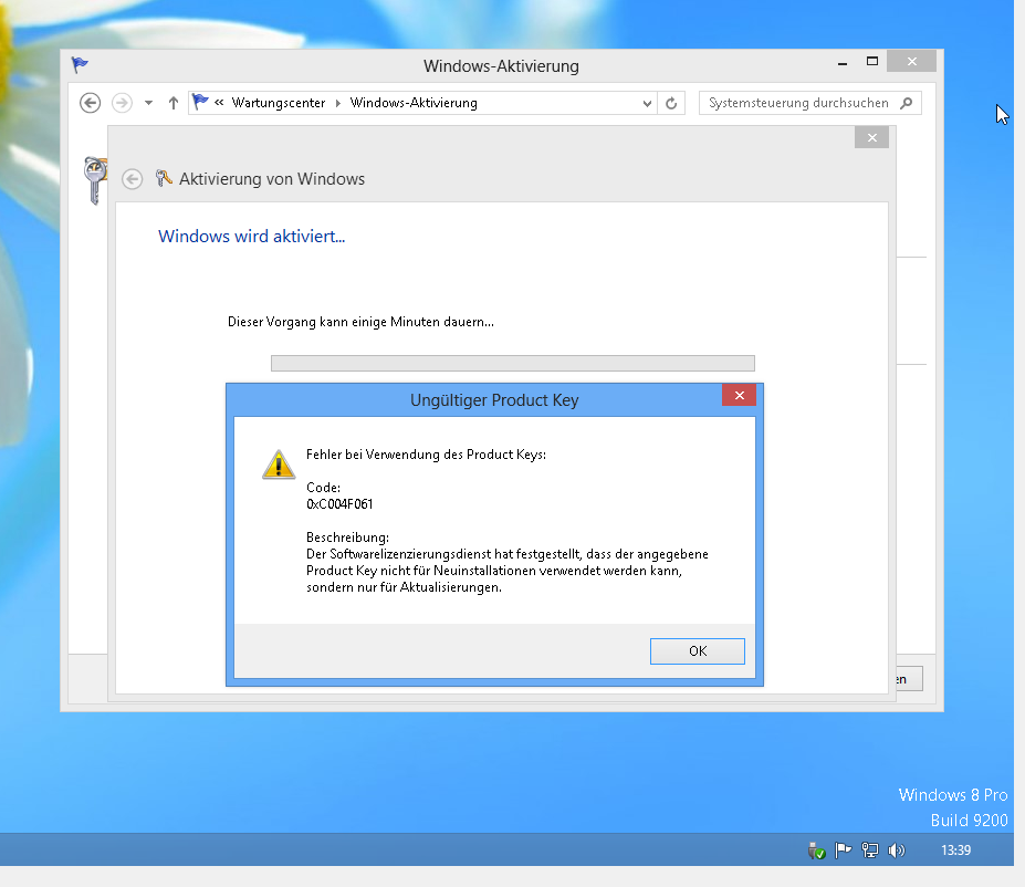 Beim Versuch es mit dem besagten Schlüssel von Hand zu aktivieren gibts dann eine Fehlermeldung. Habe es gerade mit einer Virtuellen Maschine ausprobiert.