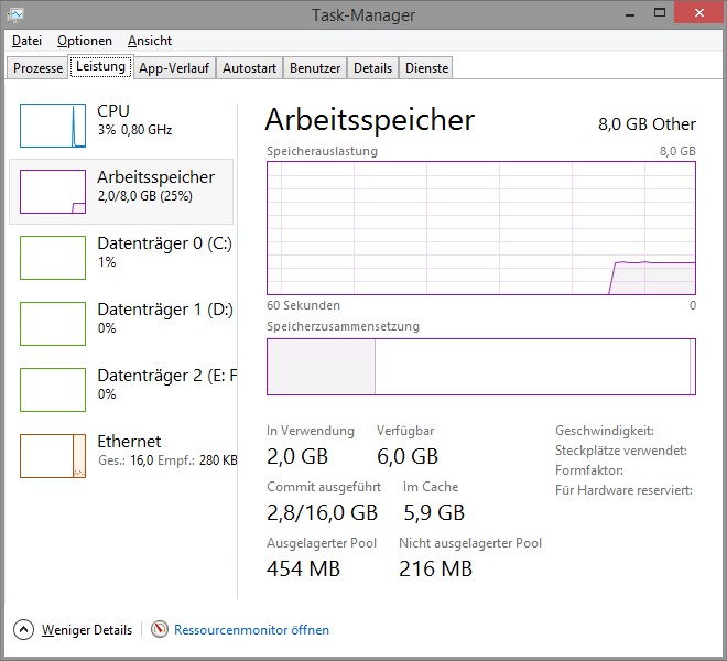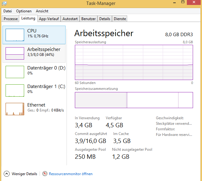 Aus irgendeinem Grund verbrauche ich extrem viel Arbeitsspeicher, obwohl ich im Taskmanager sehe, dass meine Programme fast keinen Arbeitsspeicher belegen. Komisch ist dass irgendwie im "Laufe der Zeit" magisch Arbeitsspeicher weggenommen wird, sodass ich gezwungen bin jede paar Stunden meinen Rechner neu zu starten, danach ist alles wieder gut und ich verbrauche wieder 2Gb Ram und ich habe die gleichen Programme offen.