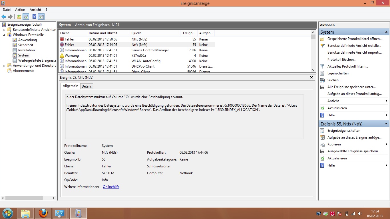 In der Verwaltung sagt mir die Ereignisanzeige des Systems "Ebene:Fehler | Quelle:Ntfs | Ereignis:55