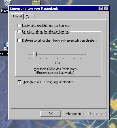Mein nächstes Problem ist, das bei einem 98 Rechner gelöschte Dateien nicht in dem Papierkorb laden, sondern direkt weg sind. Quasi so, als ob man [STRG+Entf].