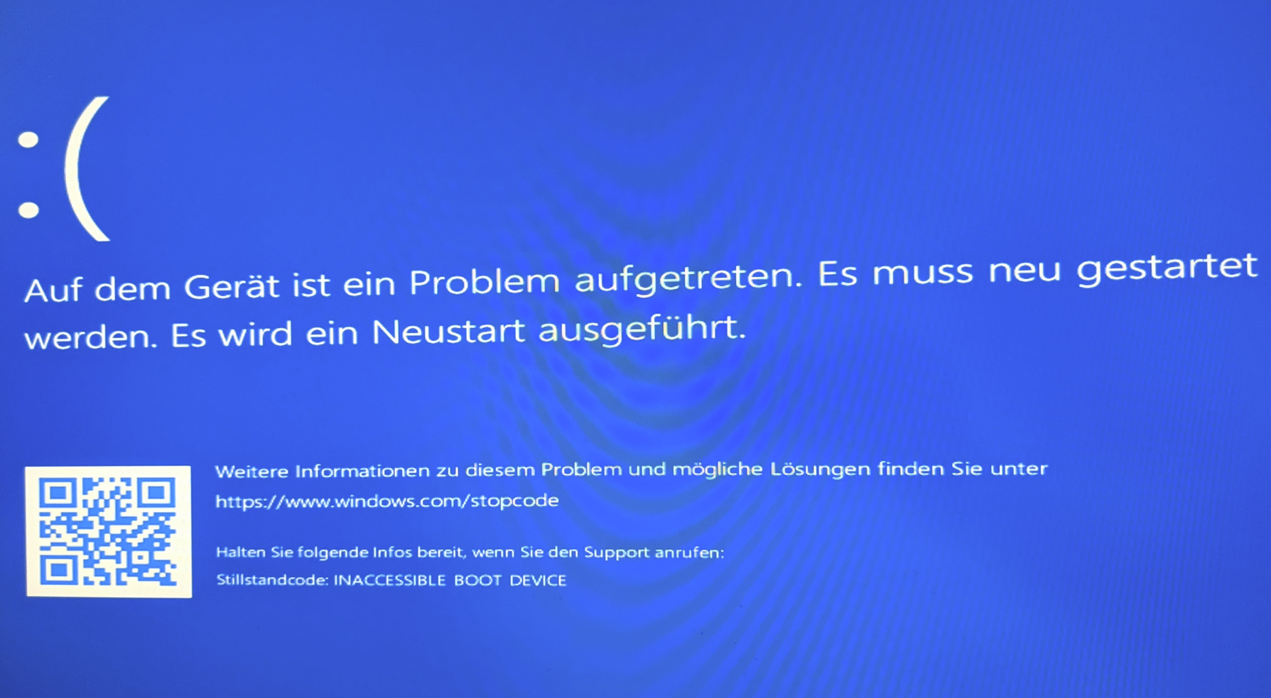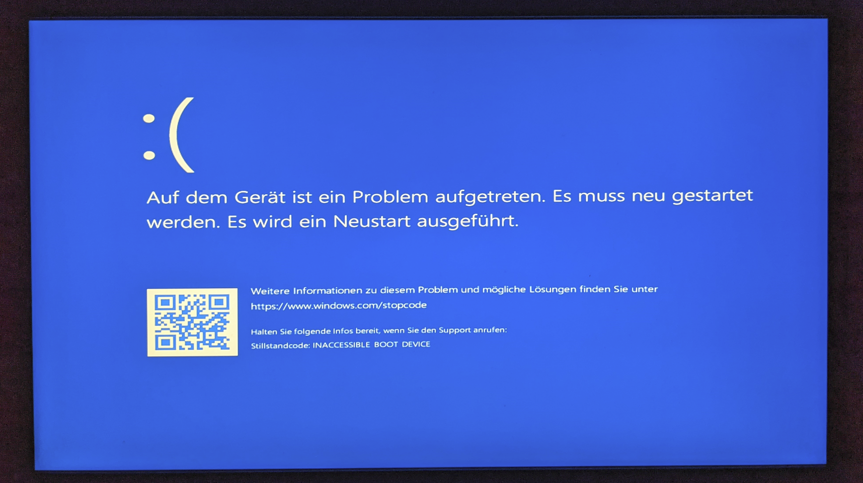 Dann habe ich die externe SSD in meinen Computer gesteckt und wollte darüber starten. Keine Chance. Immer der Bluescreen Fehler Inaccessible boot device. Dann habe ich diese externe SSD in mein Notebook gesteckt und es ging auf Anhieb.