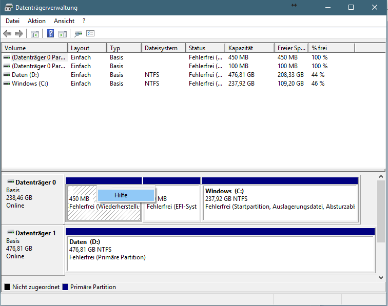 @cbtestarossa: Das zweite Bild ist das relevante, was sein Kontextmenü zeigt und bei ihm "Hilfe" mehr nicht. Das erste Bild zeigt das Kontextmenü der Partition "C" an. Und du meinst das vorletzte Bild, dort geht es aber um die UEFI Bootpartition, nicht um die Wiederherstellungspartiton, am Ende der Platte (bei ihm).