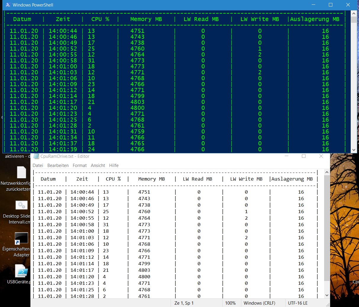 Das Script gibt Dir die Auslastungen von CPU, Speicher, Disk lesen und Disk schreiben, aktuelle Nutzung und höchste Nutzung der Auslagerungsdatei fortlaufend im Fenster und in die Datei CpuRamDrive.txt auf dem Desktop aus - bis Du eben das Powershellfenster schliesst. Man könnte auch noch die Grösse der Auslagerungsdatei mit loggen lassen.