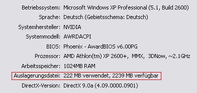 .)Bei Speicherhungrigen Anwendungen wie z.b. Serverbetrieb oder Videobearbeitung besser auf 2Gbyte festlegen damit es zu keinen Problemen wegen insgesammt verfügbaren Speichermangel kommt, für normale "Game-PC´s" ist in der Regel 512MB ein guter Wert, hier könnte zuviel sogar eher bremsen da in dem Fall mehr, jedoch nicht benötigter Auslagerungsspeicher mehr Verwaltungsaufwand bedarf.