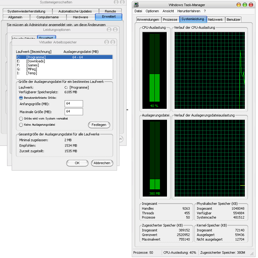 phil., das wusste ich noch gar nicht, ich habe den Registry-Eintrag bei jeder XP-Installation immer schön & treudoof gemacht. Nun gut, jetzt bin ich schlauer. Meine Auslagerung habe ich übrigens nun auch auf 256MB gedrosselt. Interessanterweise waren die 768MB bei 512MB RAM noch O.K. (=Faktor 1,5), aber die 1536MB bei 1GB RAM im aktuellen System offensichtlich zuviel. Da hat es div. Hänger bei Games gegeben, aber nun paßt's - Dank FB!