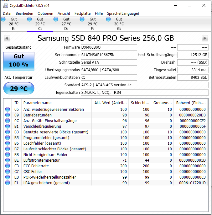 Laut Samsung Magician ist die System-SSD (840 Pro) in einem "guten" Zustand.