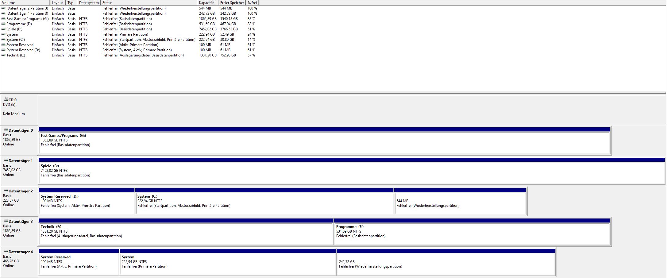 Welche SSD meinst du, laut der Datenträgerverwaltung ist nur die C Partitioniert, aber auch nur in die Partitionen, die Windows beim installieren damals festgelegt hat.AlanK schrieb:Eine(kleine)SSD würde ich auch nicht mehr Partitionieren. Ist bei dir scheinbar auch der Fall.