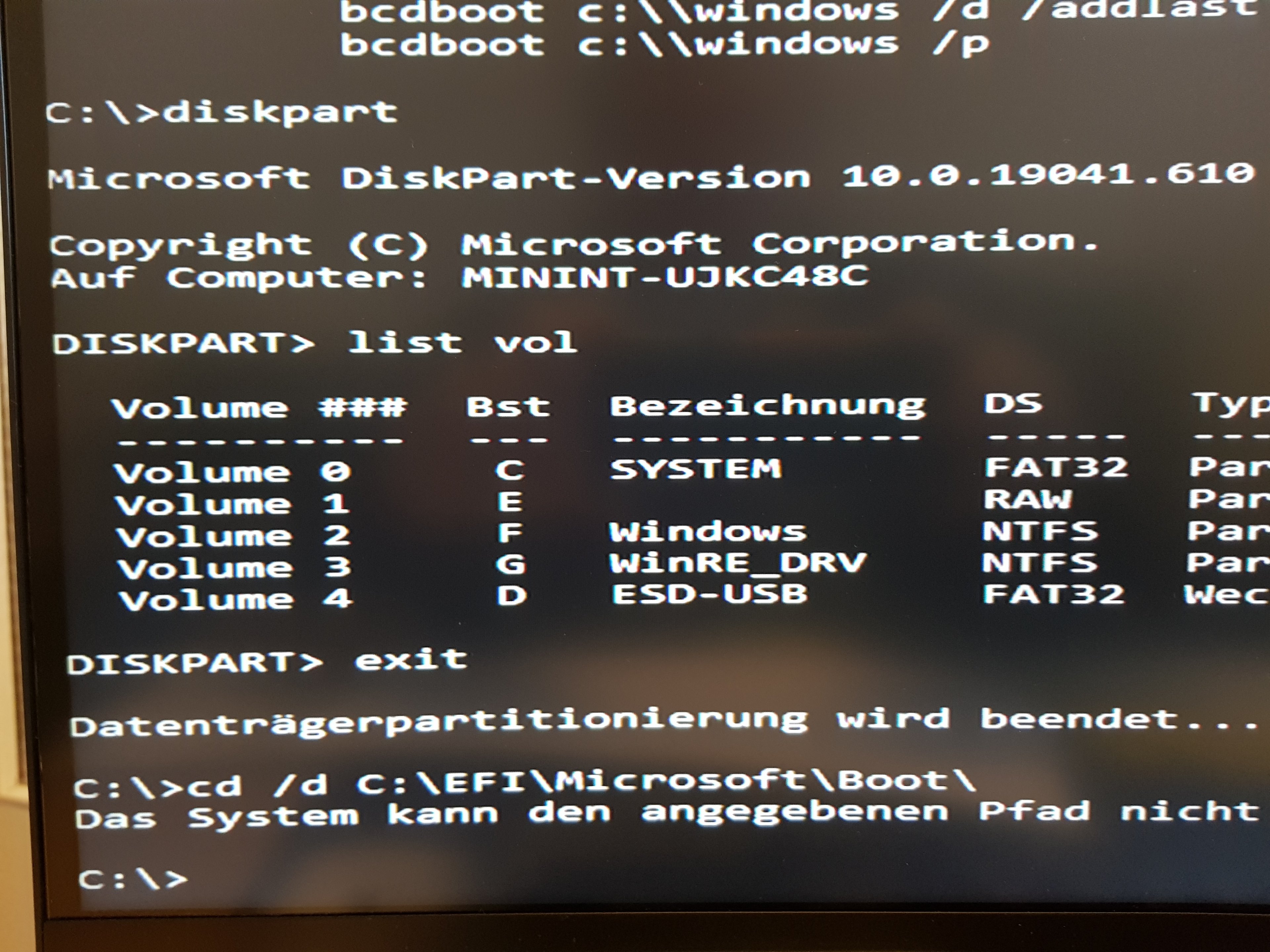 Ich habe alles mögliche aus dem Internet versucht und alle bootrec Befehle sorgfältig der Reihe nach ausgeführt. Es scheitert immer wieder an dem fixboot-Befehl.