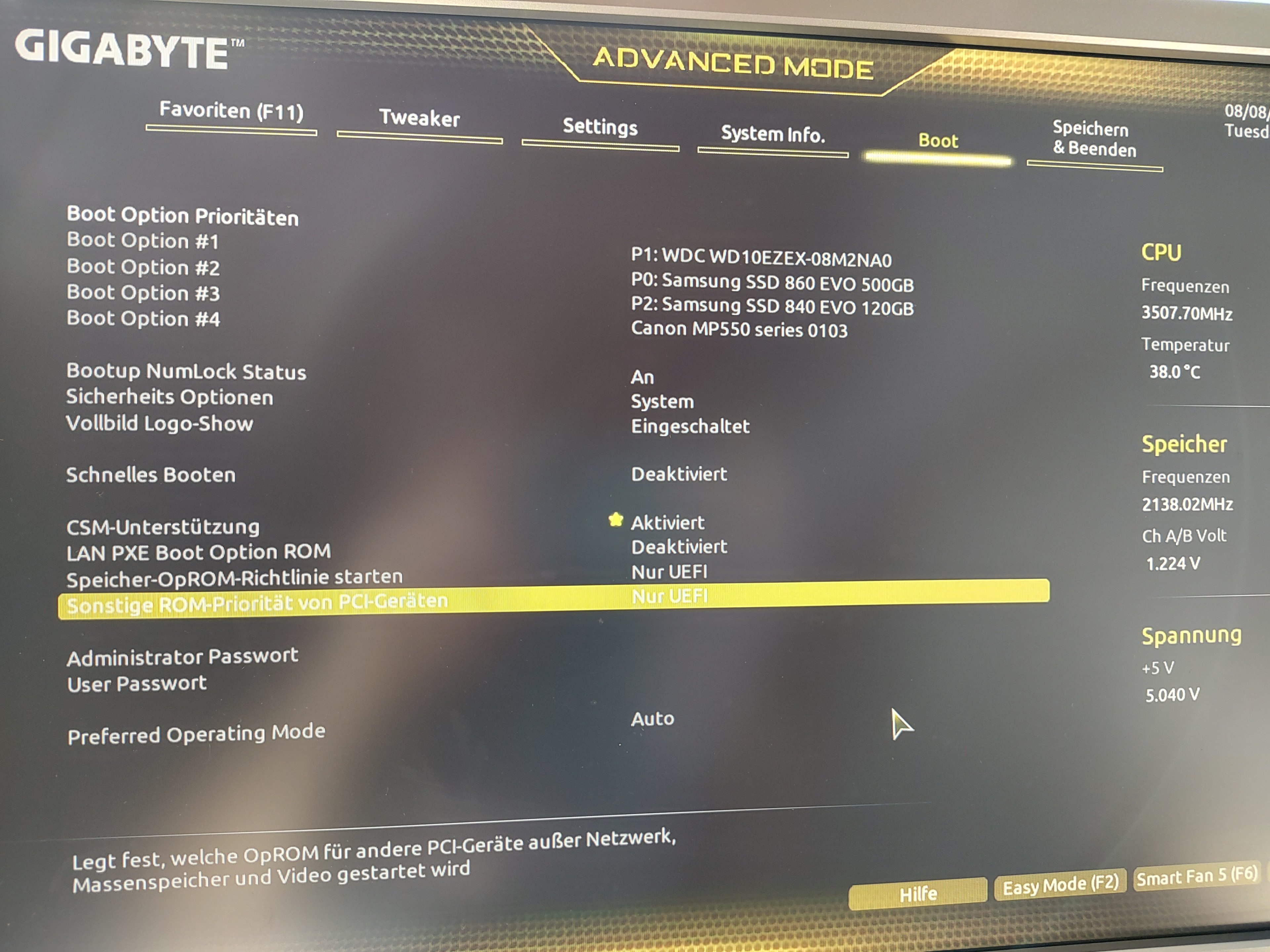 Hinweis: bei den Boot settings im BIOS wird die Festplatte erkannt und steht auch auf Platz 1.
