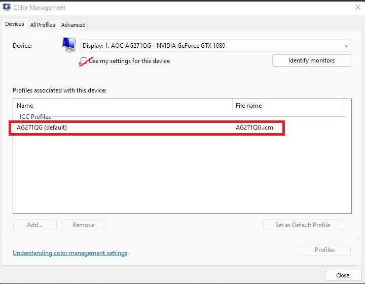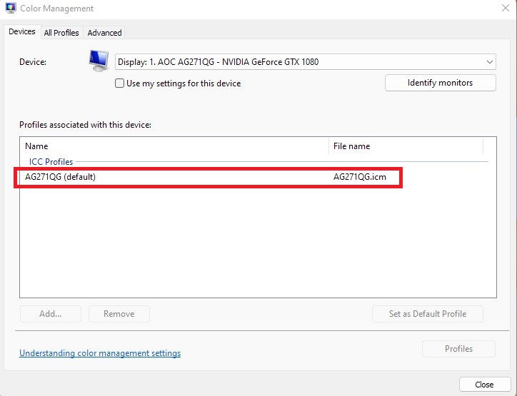 bislang habe ich die Windows Color Management settings unangetastet gelassen und die von Windows installierten Treiber für den Monitor (AOC AGON AQ271QG) benutzt... er wurde im Device Manager als "Generic Display" bezeichnet.