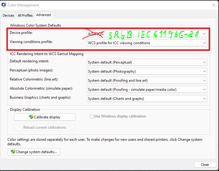 Muss ich nun im Windows Color Management - Advanced Tab weitere Einstellungen vornehmen? Oder einfach bei System Default (=sRGB Viewing Condition) belassen? Was ist der Unterschied zwischen sRGB Viewing Condition und ICC Viewing Condition?
