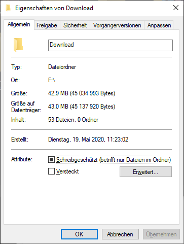 Wenn ich mir die Eigenschaften meines Download Ordners anzeigen lasse hat dieser eine Größe von 42,9 MB 53 Elemente wenn ich jedoch in den Ordner gehe und dort alles auswähle haben die Elemente nur eine Größe von 43,3 MB 52 Elemente. Es wird ein Element mehr Angezeit als es im Ordner ist.