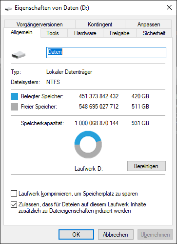 wenn ich die Eigenschaften von D:\ ansehe steht dort es sind 420 GB gelegt.