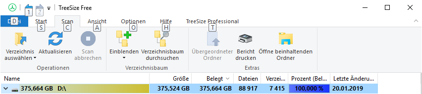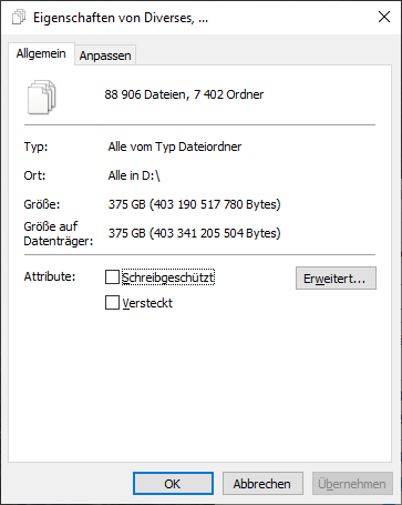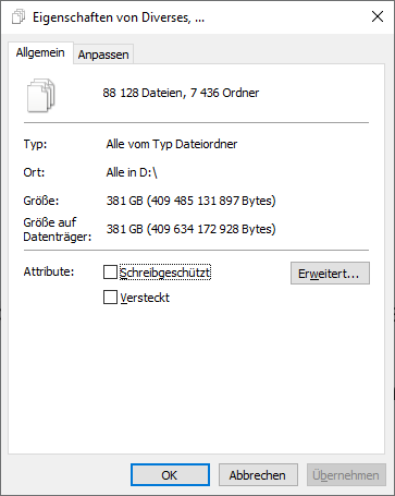 Wenn ich jedoch alle Ordner auf der Grundebene von D:\ makiere und mir die Eigenschaften ansehe steht dort 381 GB belegt.