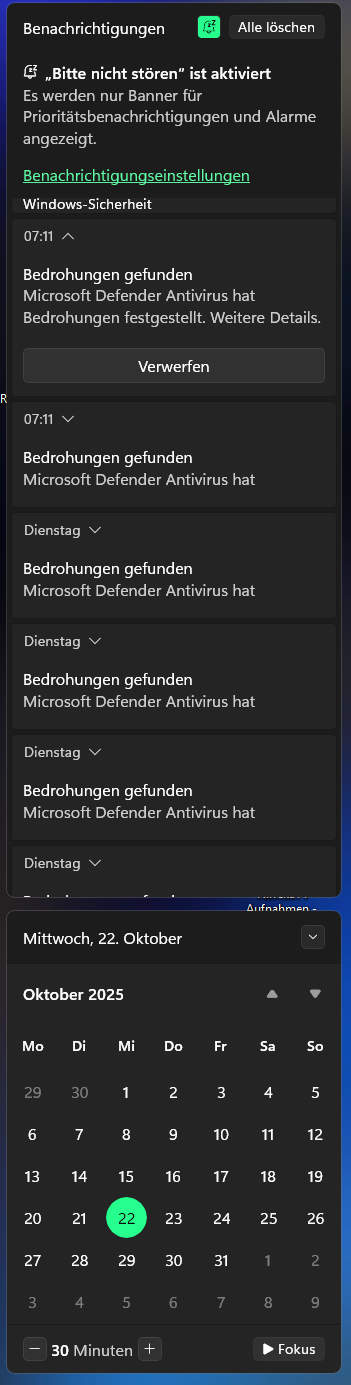Heute habe ich zum aller ersten Mal seit ich Windows 7/10/11 überhaupt verwende von Windows Defender Benachrichtigungen über Bedrohungen erhalten.